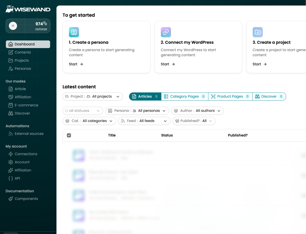 Générez des articles SEO qui performent vraiment ! Pas juste pour Google, mais aussi pour vos lecteurs. Wisewand combine IA, stratégie éditoriale et bon sens SEO pour créer des contenus utiles, lisibles, et bien positionnés.